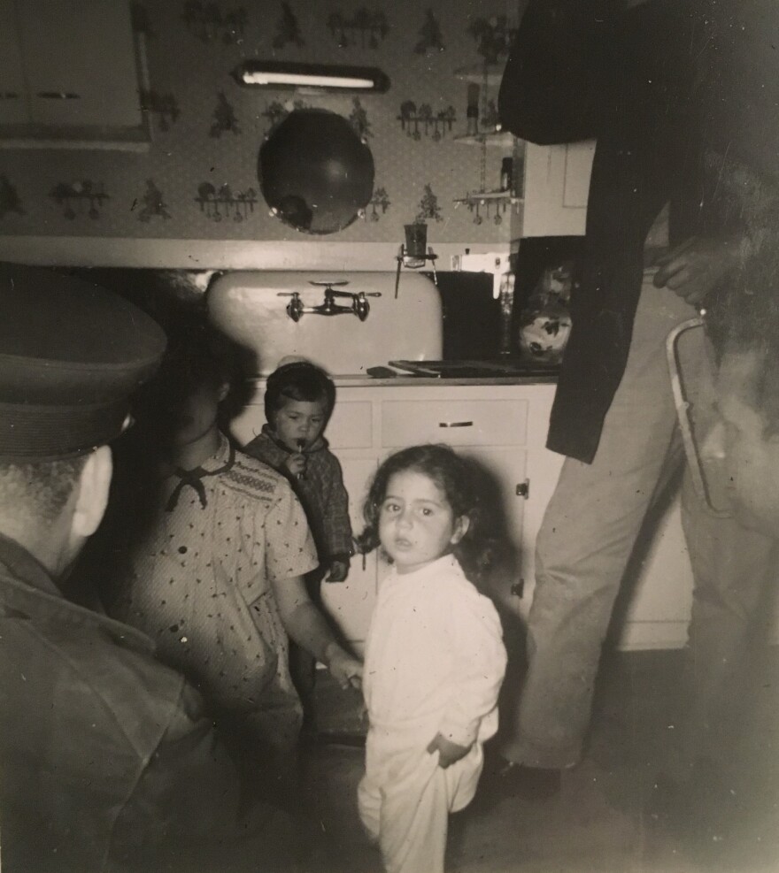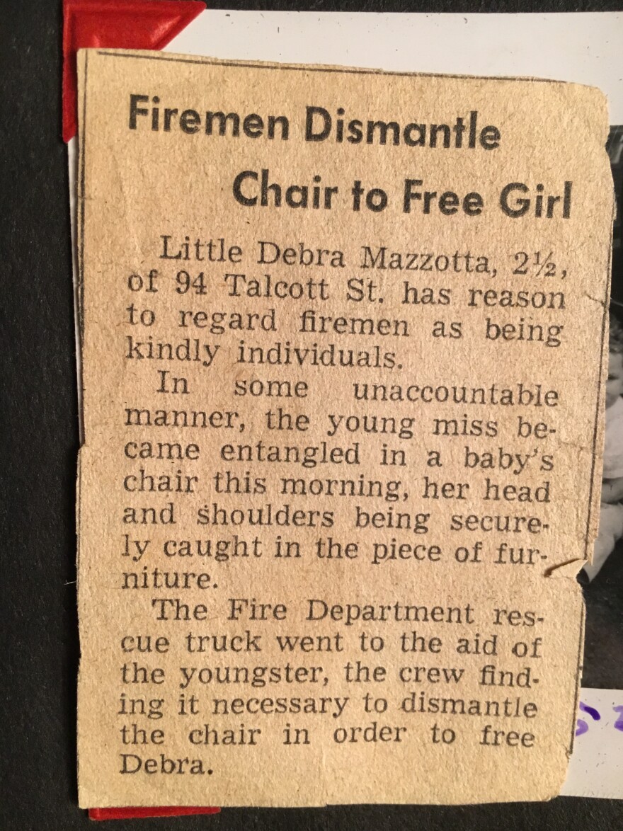 wearing it like a hat. My mother couldn’t disentangle me, so she called the fire department. A truck arrived with sirens blaring. Enormous men tramped into our tiny kitchen. One approached me with a saw in hand, causing terror to ripple through my two-year-old soul.